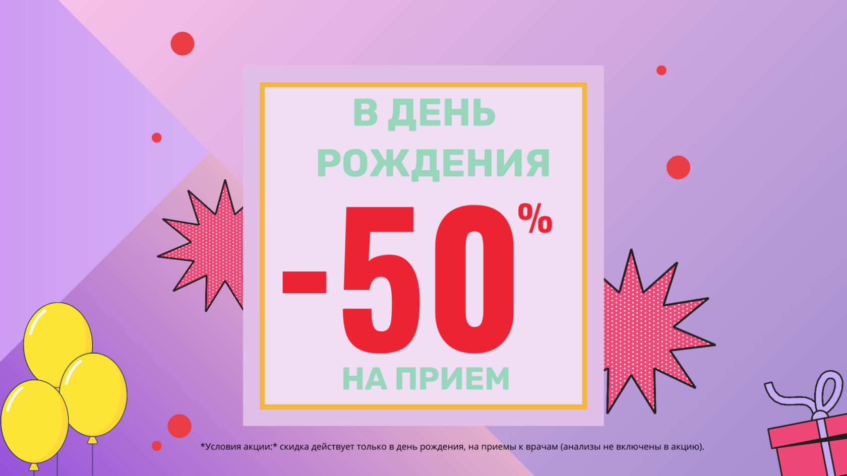 : скидка действует только в день рождения, на приемы к врачам (анализы не включены в акцию). По предъявлению паспорта.